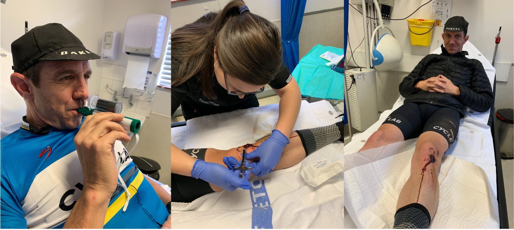 I quickly assessed what had happened. Damn! I didn’t feel like I’d got badly hurt. I had some grazes on my left shoulder, left foreram, left quad and left knee. Whoa! I did a double take at my left knee. It was grazed, but there was also a deep hole and I could see what looked like bone in that hole. It wasn’t really bleeding much, but I knew it would require stitching.