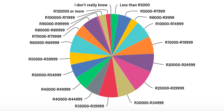 Some observations: A total of 10.48% spent less than R10 000; a total of 24.22% spent under R20 000; a total of 30.93% spent between R20 000-R40 000; a total of 21.14% spent between R40 000-R60 000; a total of 17.88% spent between R60 000-R90 000.