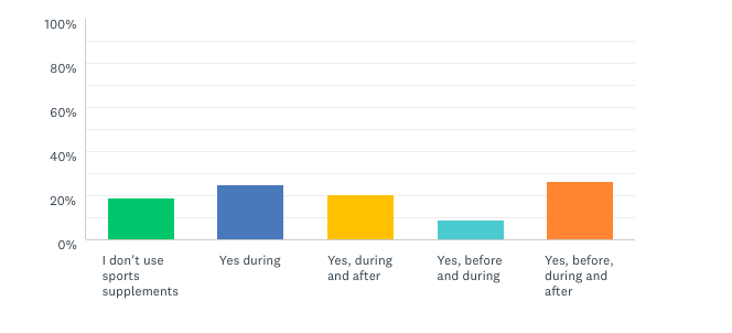 A total of 18.87% say they don’t use sports supplements, while the overwhelming majority do, during important rides or races. In fact, 26.59% say they use sports supplements before, during and after an important ride or race.