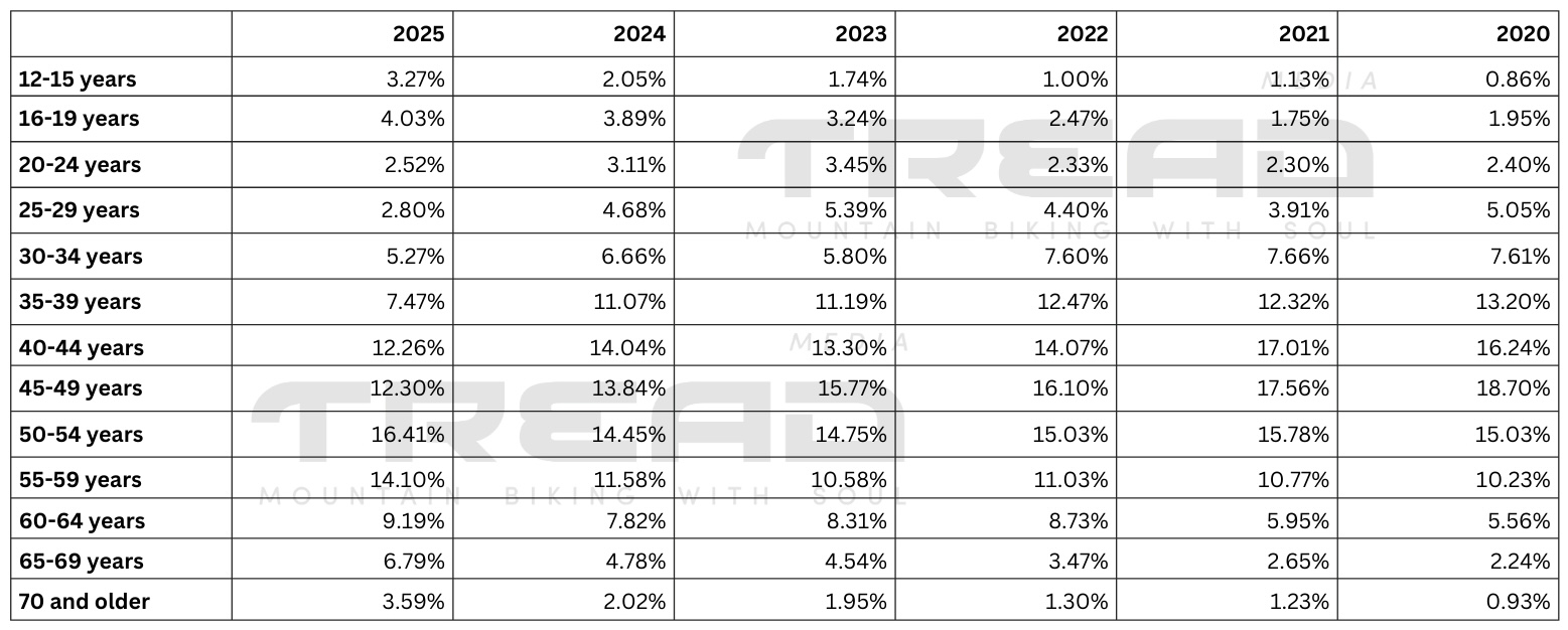 Generally, based on this survey, mountain biking in South Africa seems to be trending even more towards middle-aged and elderly age categories. It is heartening to see increases among teens, but there’s a drop in the 20-49 year segment.