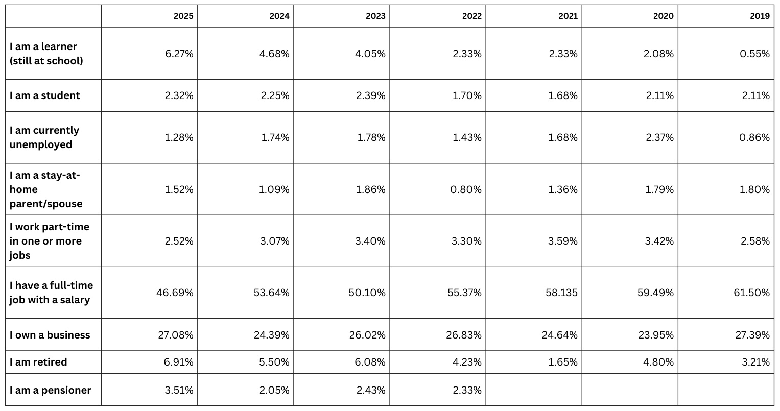 An encouraging increase in school learners – they generally don’t have the patience to take a 10-minute survey. Interesting to see the big drop in those with a full-time job over the previous year. Retirement, pension and own business all increased a little.