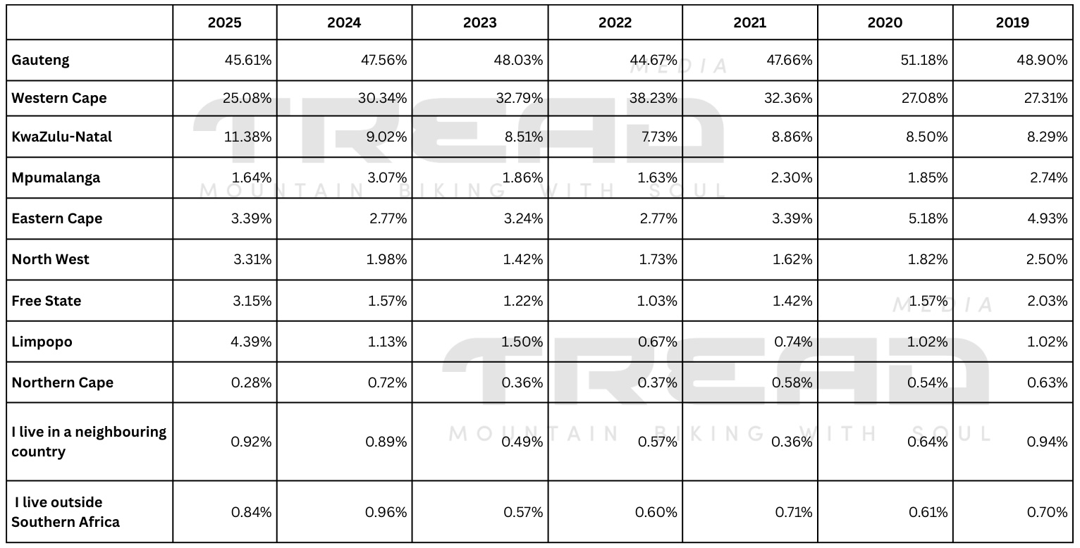 This is our most interesting response to date on this statistic. Thanks to Cycling South Africa sharing our survey link, we received more responses from the smaller provinces than ever before, giving what appears to be a fairer reflection on the market spread nationally. Gauteng remains by far the most populated province when it comes to mountain bikers, with Western Cape dropping somewhat over the previous year, mostly likely due to the better spread of survey takers.