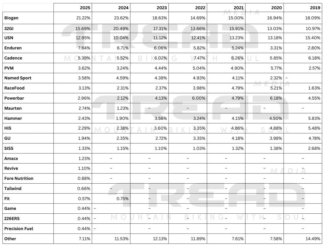 Biogen, 32Gi and USN remain respectively the most popular sports supplement brands among South African mountain bikers. There are some new brands mentioned this year and we included all brands on this list that had 10 or more mentions.