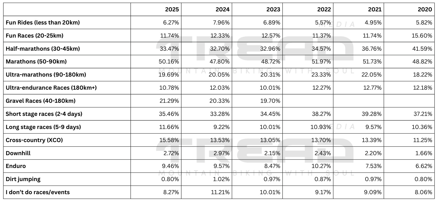 Half-marathons, marathons and short stage races are still the most popular types of mountain bike events in South Africa. Gravel races continue to show a gradual increase over the previous two years.