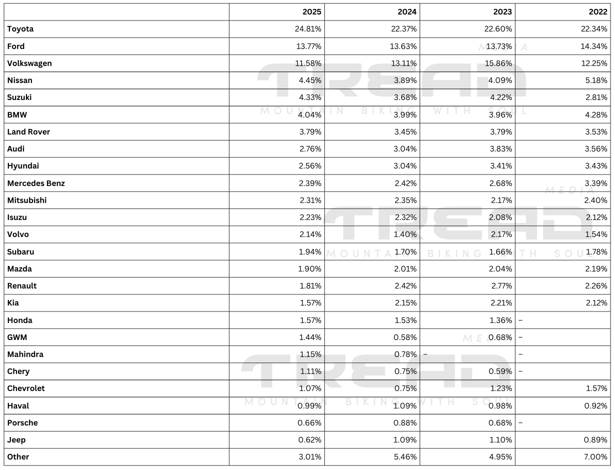 Chinese motor brands may be causing a shift in South Africa, but mountain bikers still favour mostly Japanese and German car brands. Based on this survey, almost a fifth of South African mountain bikers own a Toyota!