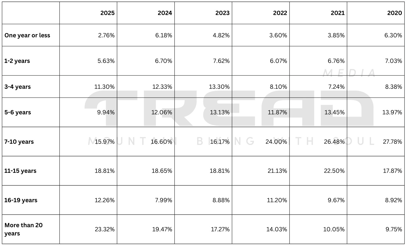Thule remains by far the most dominant brand. Buzzrack, meanwhile, has gradually shown an increase each year moving into double digits in 2025. We added a few more brands that got at least two mentions and will keep an eye on them going forward too.