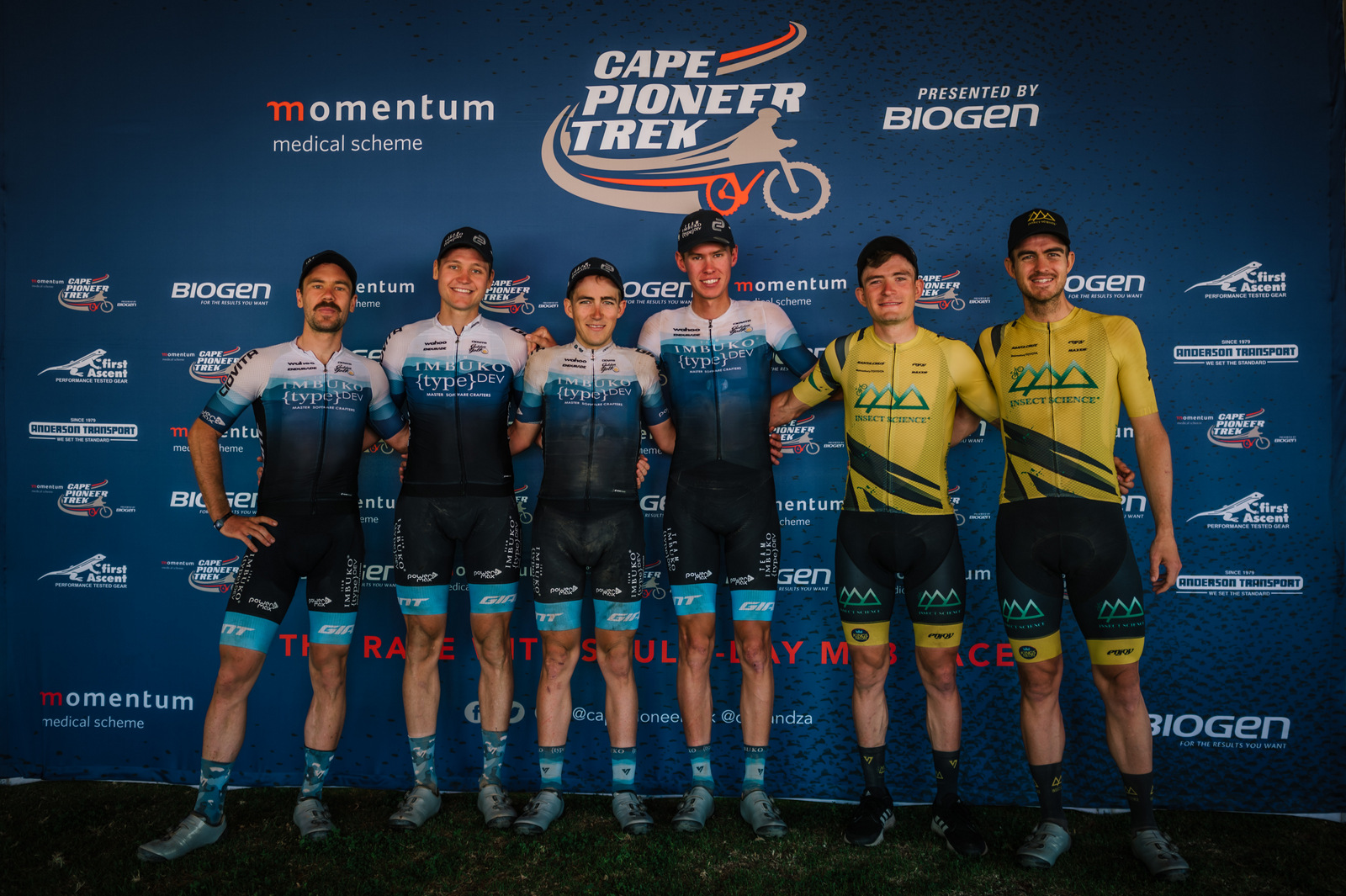 Imbuko {type}DEV B re-joining the group of Marco Joubert, Pieter du Toit, Arno du Toit and Keagan Bontekoning did not result in a lull in the action. Each of the teams tried in turn to shake the others, but with the added fire power of two squads Imbuko {type}DEV always had the upper hand. This meant that for the second day in a row the Momentum Medical Scheme Cape Pioneer Trek, presented by Biogen came down to a sprint.