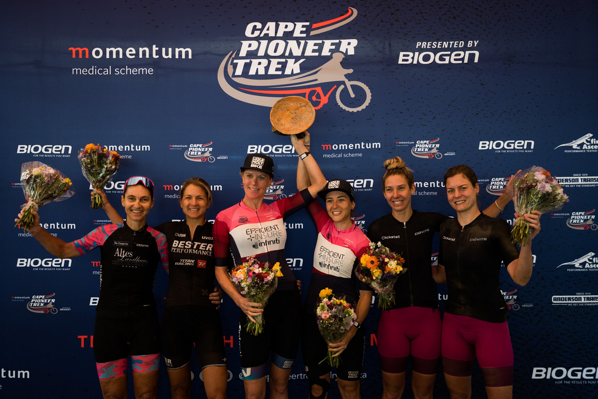In the women’s race the final stage also provided some drama, though with a 32 minute overall lead it would have taken a complete catastrophe for Kim le Court and Theresa Ralph to be dethroned. “We actually spoke about trying to see if we could give a stage victory to the Clickatell team,” Le Court recounted. “But that was clearly tempting fate and Murphy’s Law punished us with a puncture.”