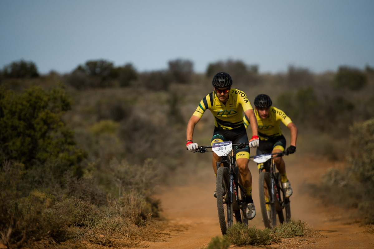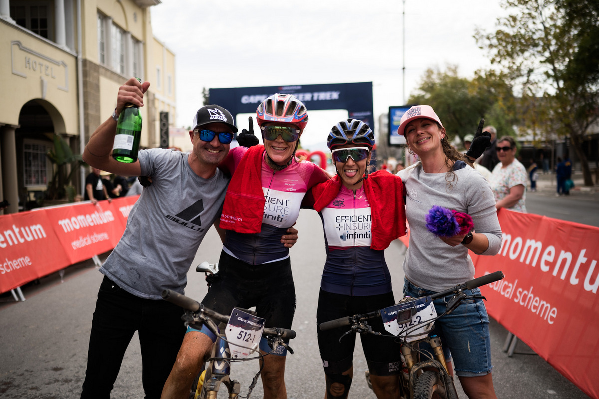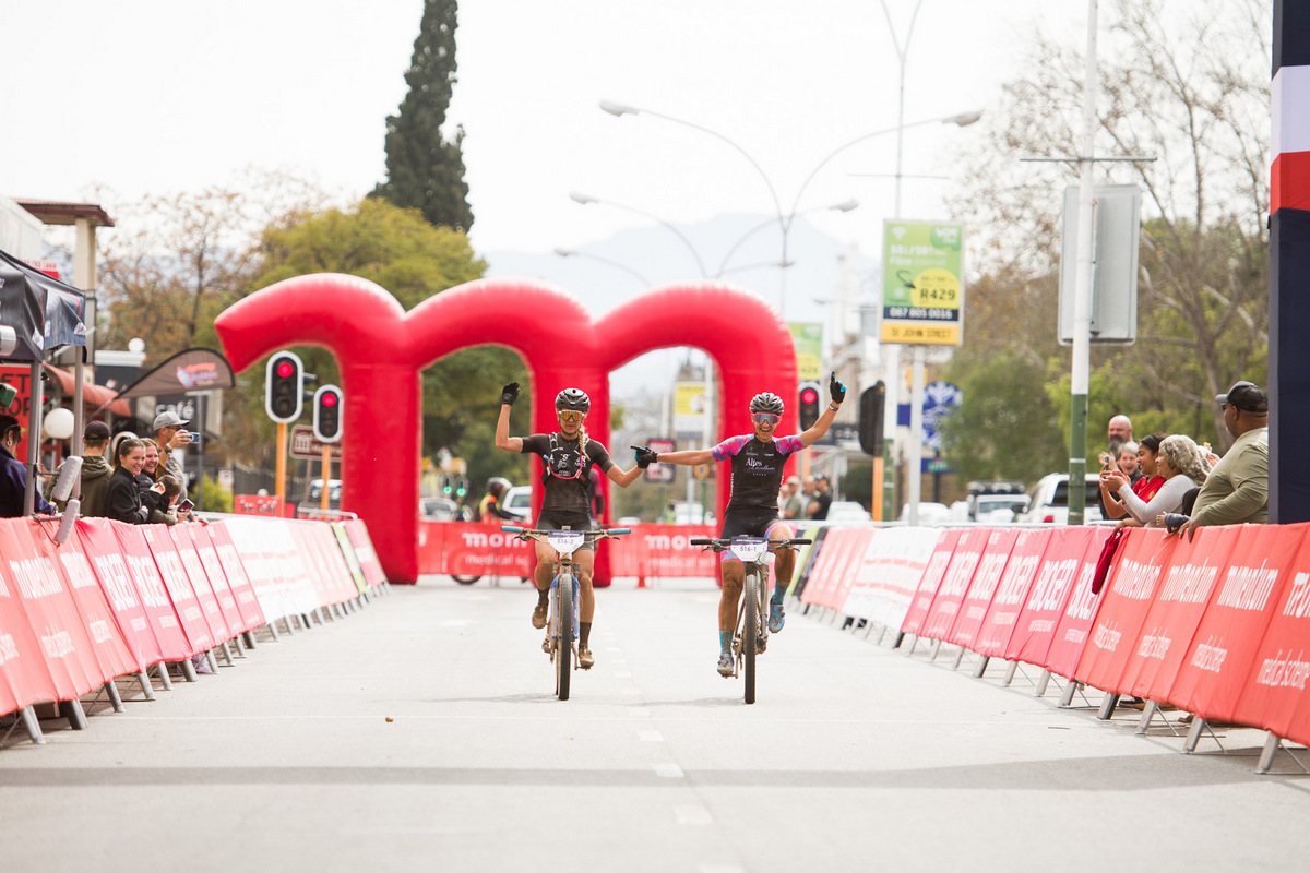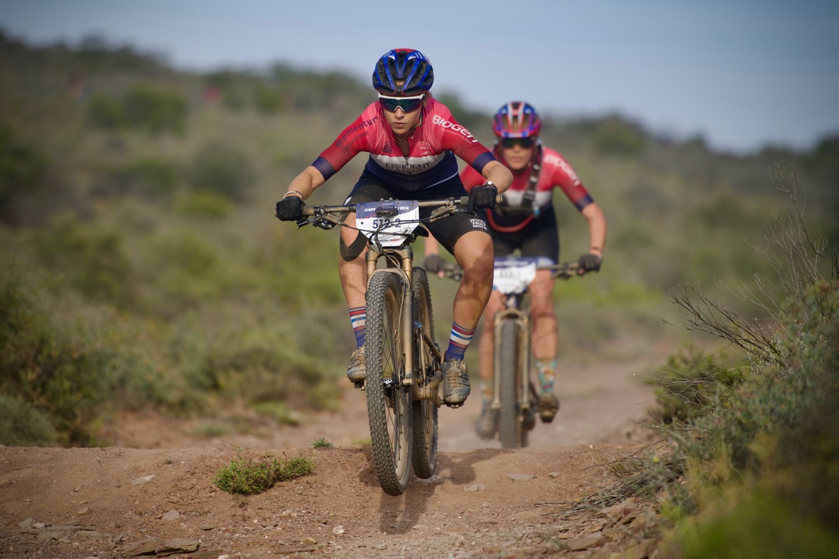 Imbuko {type}DEV A and Efficient Insure Infiniti Racing wrapped up the 2022 Momentum Medical Scheme Cape Pioneer Trek, presented by Biogen, titles in Oudtshoorn on Saturday, 10 September. Both the men in the yellow First Ascent leaders’ jerseys and the women in pink suffered punctures on Stage 6, but could rely on the buffers they had established over the preceding six days to avoid panic. Thus, despite losing out on stage honours, to Insect Science Pro and MadMacs Coopetto Bester Performance respectively, the overnight leaders were able to secure the general classification victories.
