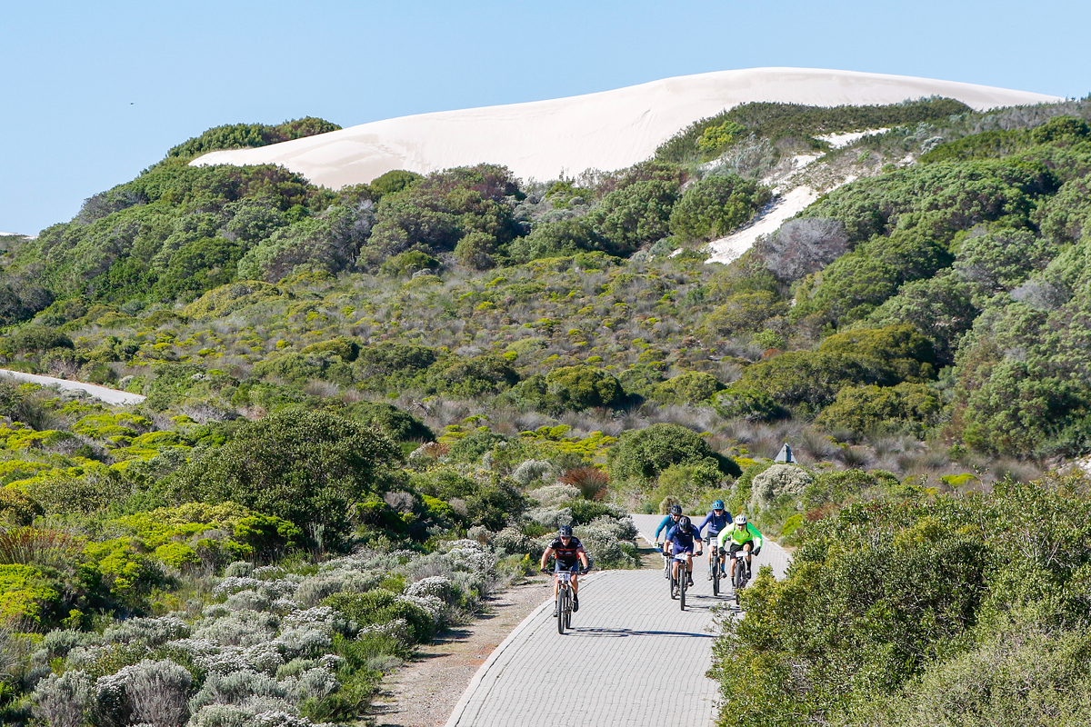 The routes are a combination of gravel road, jeep track and singletrack. Each day’s route takes you to a different part of the reserve where you can appreciate the rocky coastlines, large sand dunes, beautiful blue ocean (whale-spotting is a highlight), lowland fynbos and thriving wetlands. Game you’re likely to encounter include Eland, Cape Mountain Zebra, Grey Rhebok and Bontebok; with Caracal and Leopard spotted only by the lucky few.