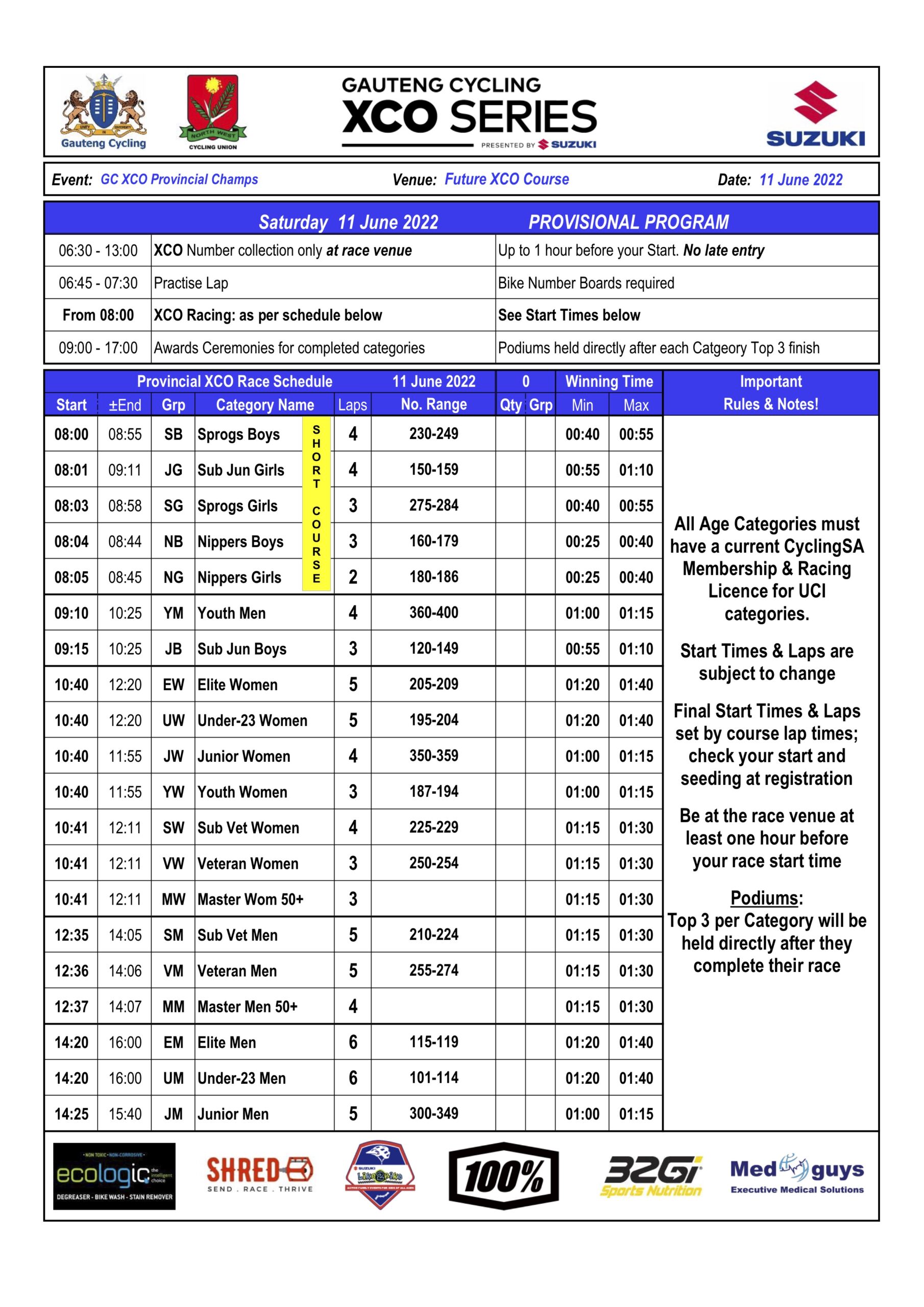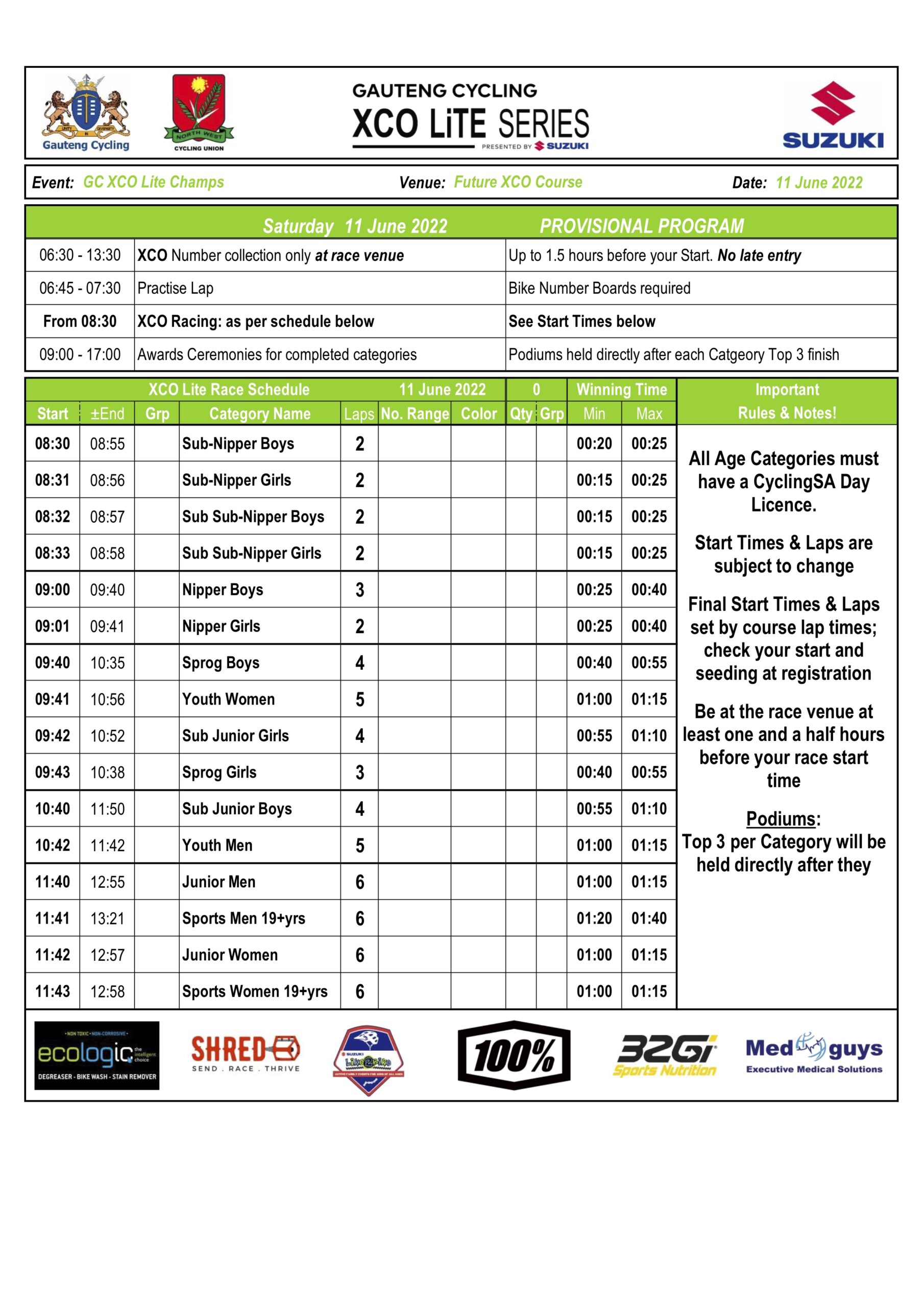 Suzuki is the presenting sponsor the 2022 Gauteng XCO Series and provincial championships. Other brands that have invested in the sponsoring the Gauteng XCO Series are EcoLogic (bike wash products), 100% (eyewear products), 32 GI (performance supplements), Med Guys (medical support) and SHRED (media partner).