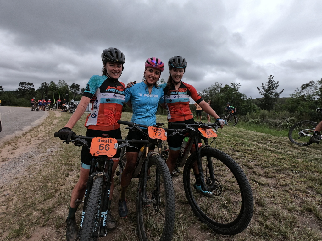 Danielle Strydom (centre) won Stage 1, ahead of Frances Janse van Rensburg (right) and Christie Hearder (left) of Absolute Motion. Photo by Seamus Allardice.