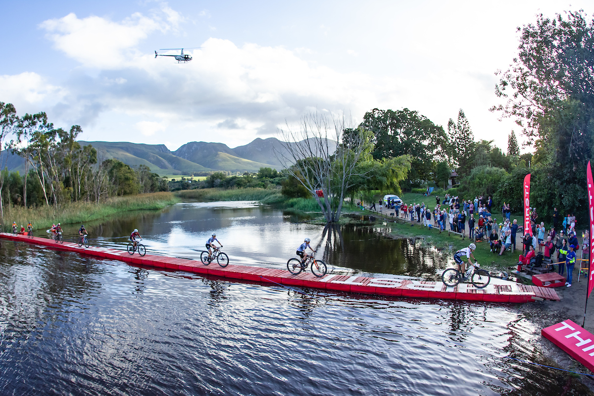 In both the Men’s and the CM.com Women’s races, the riding was tense and tactical. The men started at a furious pace, charging towards the village of Stanford. Early pacesetters included Toyota-Specialized-NinetyOne, SCOTT-SRAM MTB Racing, ORBEA x Leatt x Speed Company, Wilier Pirelli Factory, Canyon Northwave MTB, PYGA Euro Steel and Imbuko TypeDev. The lead bunch went through the 42km mark in a time of one hour and 11 minutes, barely noticing the festive Stanford revellers and party boat as they crossed the Thirsti floating bridge ahead of the water point.