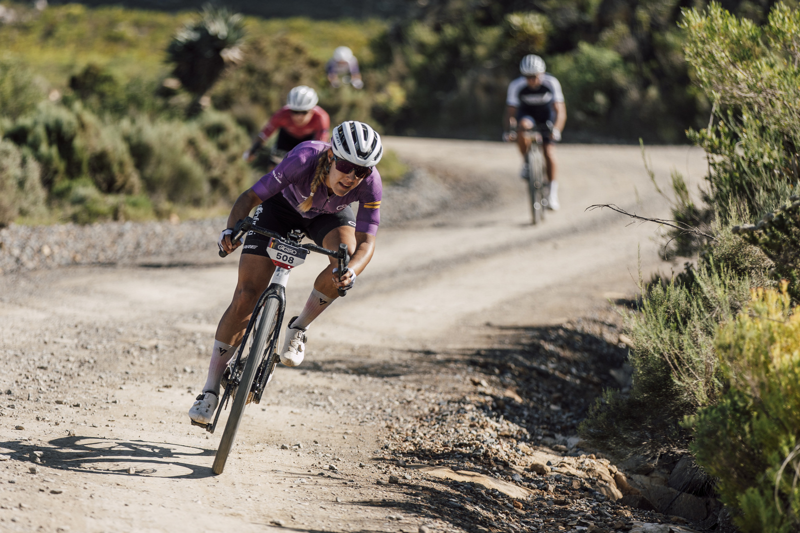 The northern route up Swartberg Pass from Prince Albert, where Stage 4 of the Garden Route Giro started, is steeper in places than the southern side. Regardless of the gradient or the distance, Cronje Beukes and Mariëlle Trouwborst were once again the strongest climbers in the race. The story of their stage victories on Thursday, 16 April, was not told in their entirety by dominance on the biggest ascent of the race, however. Beukes rode bravely, choosing to go solo when waiting for the group would have been the safer option, while Trouwborst stopped to replace a battery in her electronic shifter, but still put time into the nearest challengers, Lisa Bone and Vera Looser.