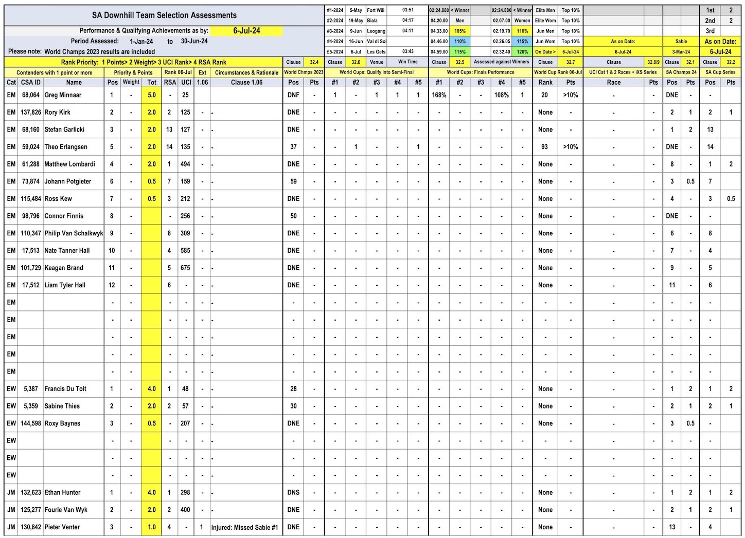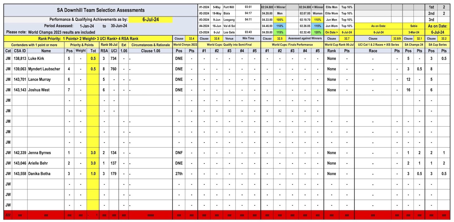 Below is the selection criteria data for the 2024 UCI Downhill World Championships. This is also published and updated regularly on the Cycling South Africa website here.