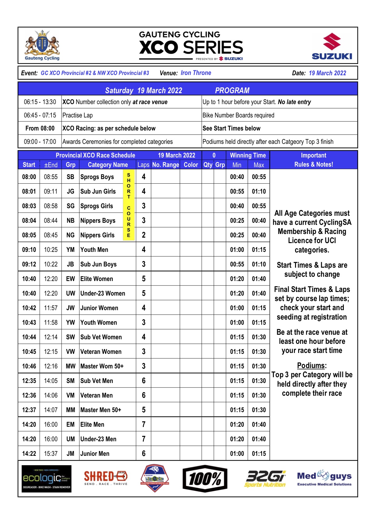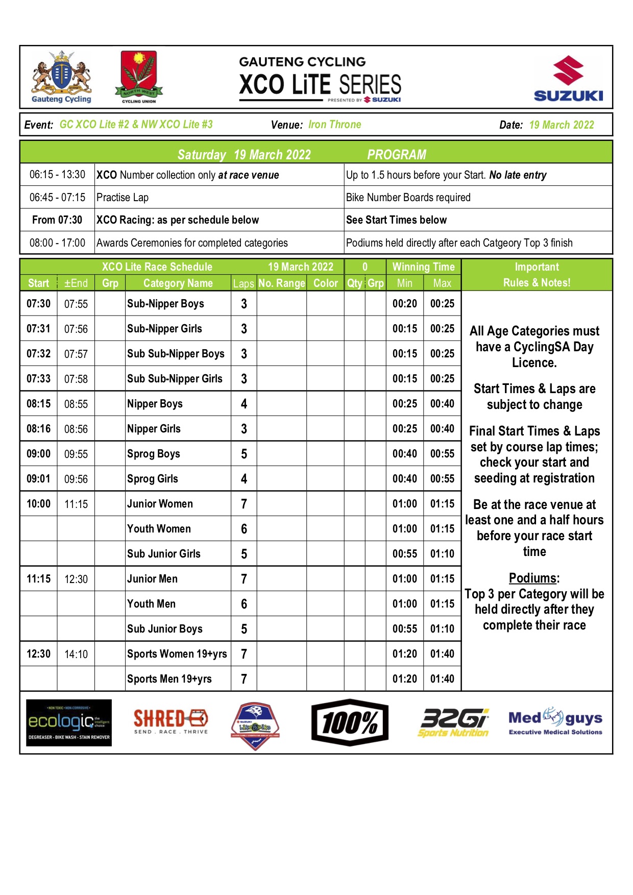 Suzuki is the presenting sponsor the 2022 Gauteng XCO Series. Other brands that have invested in the sponsoring the Gauteng XCO Series are EcoLogic (bike wash products), 100% (eyewear products), 32 GI (performance supplements), Med Guys (medical support) and SHRED (media partner).
