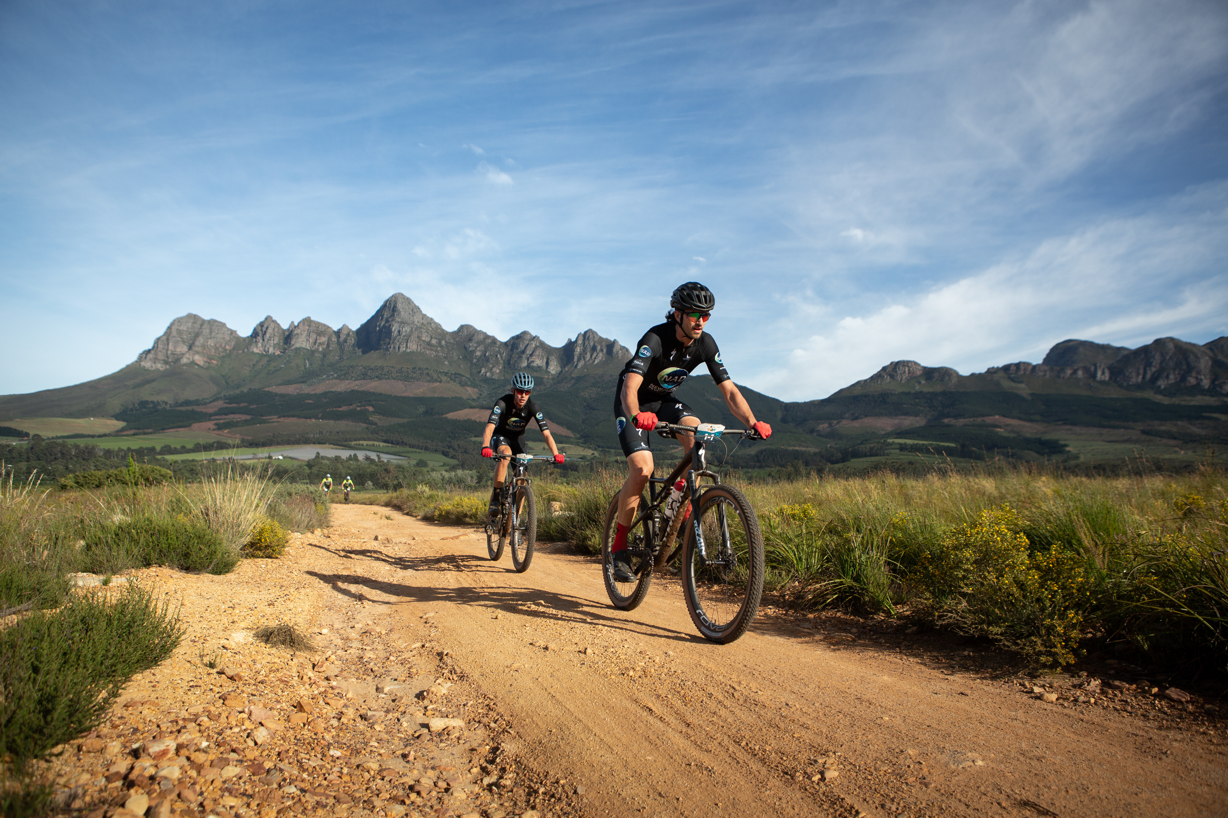 Matt Beers and Wessel Botha during the 2019 FNB Wine2Whales Shiraz 3 day mountain bike event stage1 from Lourensford to Oak Valley. Image by Nick Muzik
