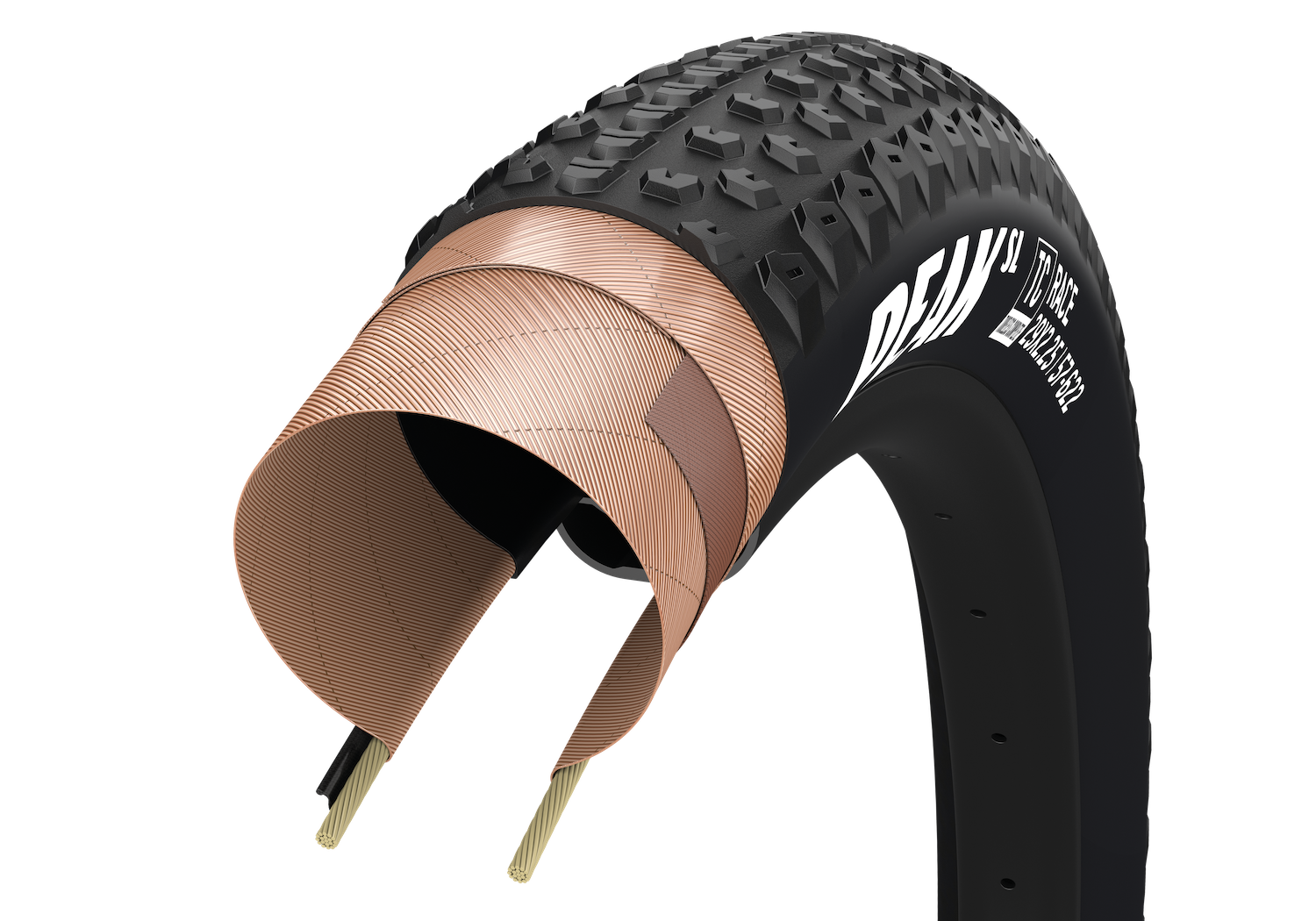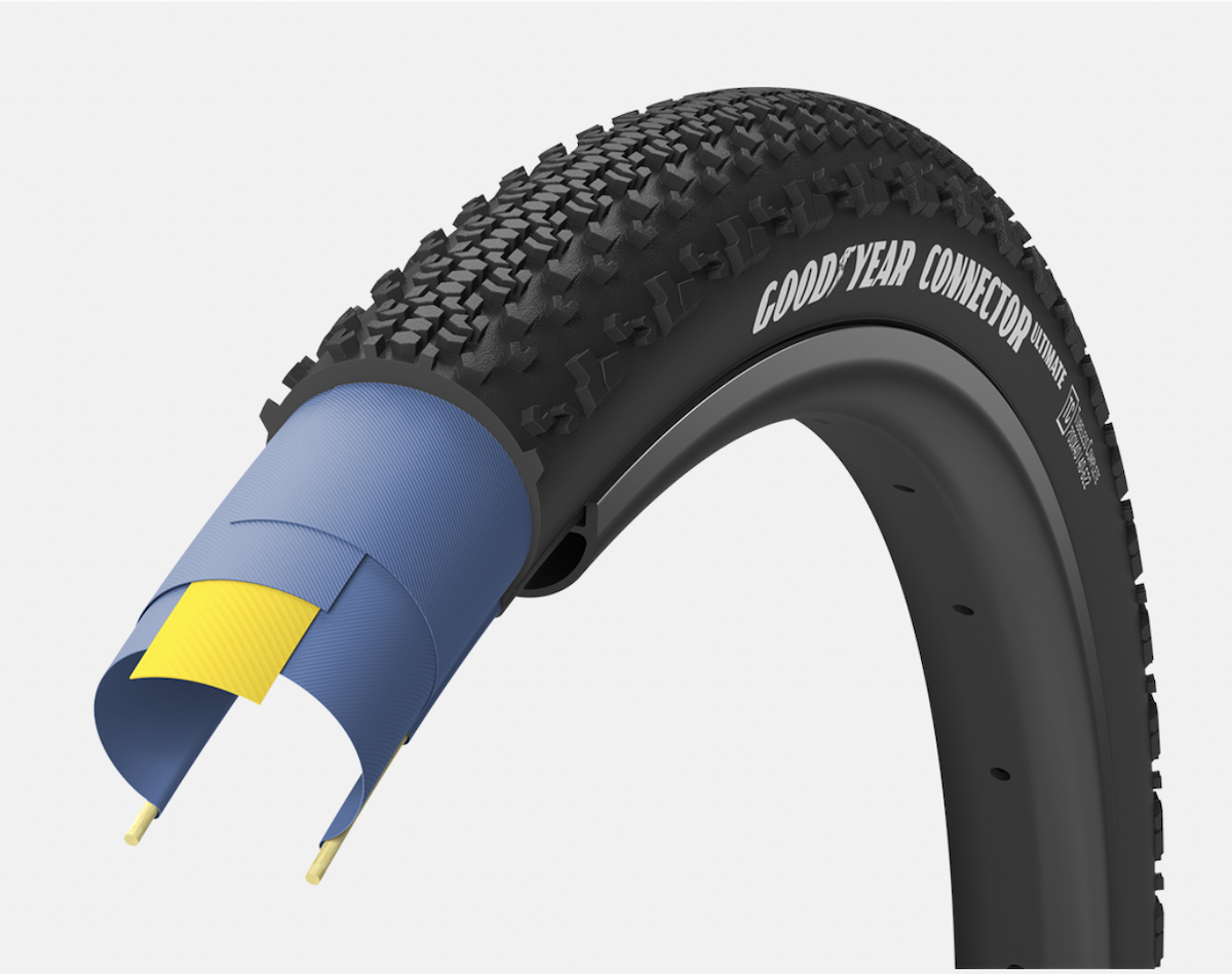 The hard-hitting member of the Goodyear gravel family, with a tread pattern designed to excel in off-road terrain, with widely spaced blocks to aid grip and forward drive in wet or very loose conditions. The Ultimate, Tubeless Complete features a Multi-compound material layer which is added to the tyre casing, allowing for improved air retention while providing additional puncture and cut protection with minimal weight increase.