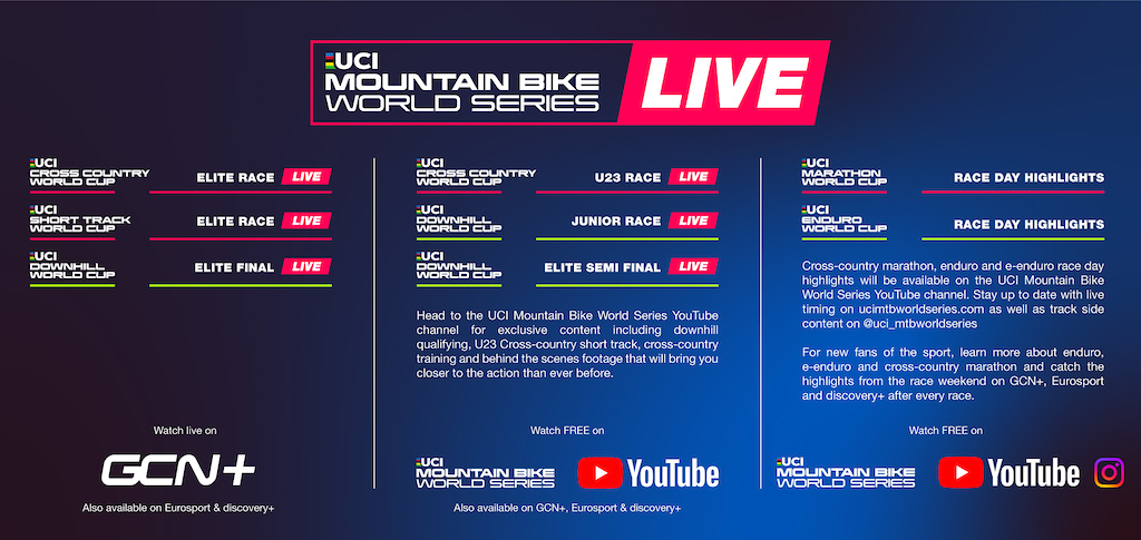 In addition to the live UCI World Cup racing, we will also be able to watch, for free, on the UCI Mountain Bike World Cup YouTube channel, highlights packages of the UCI Marathon World Cup rounds and the UCI Enduro World Cup rounds. These will also be shown on GCN+.