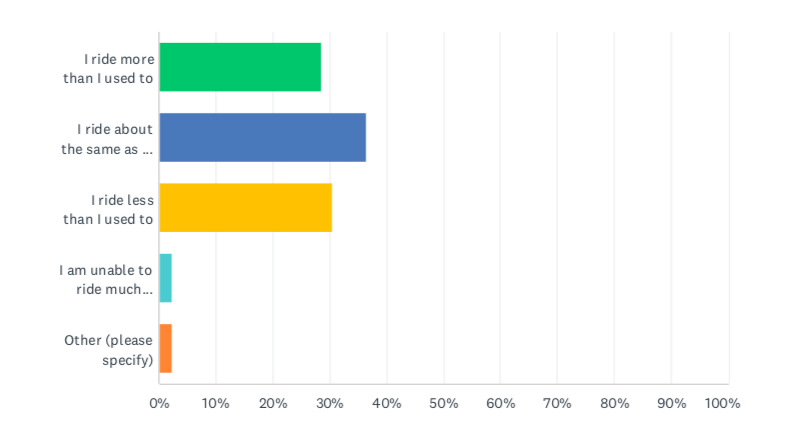 Comments in ‘other’ include ‘I ride less outdoors and more indoors’; ‘I ride less, but run more’ and ‘rode less in 2020, but more in 2021’