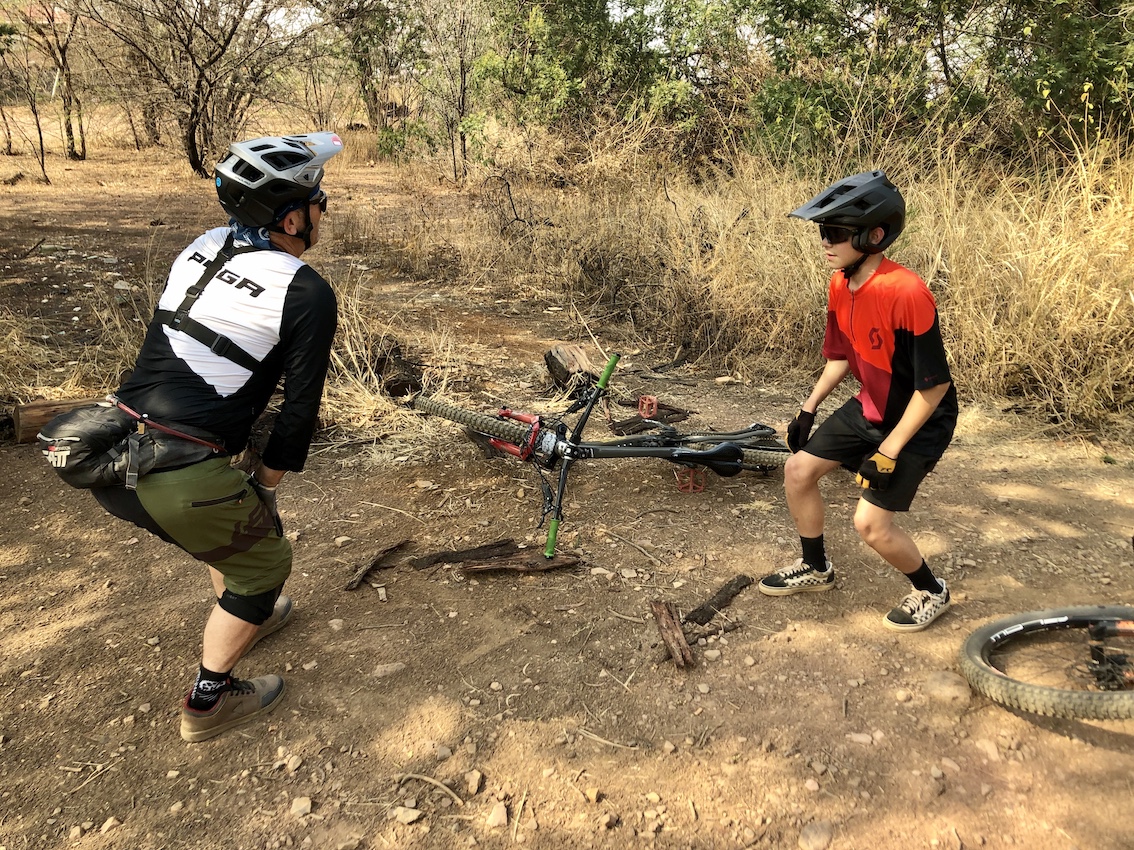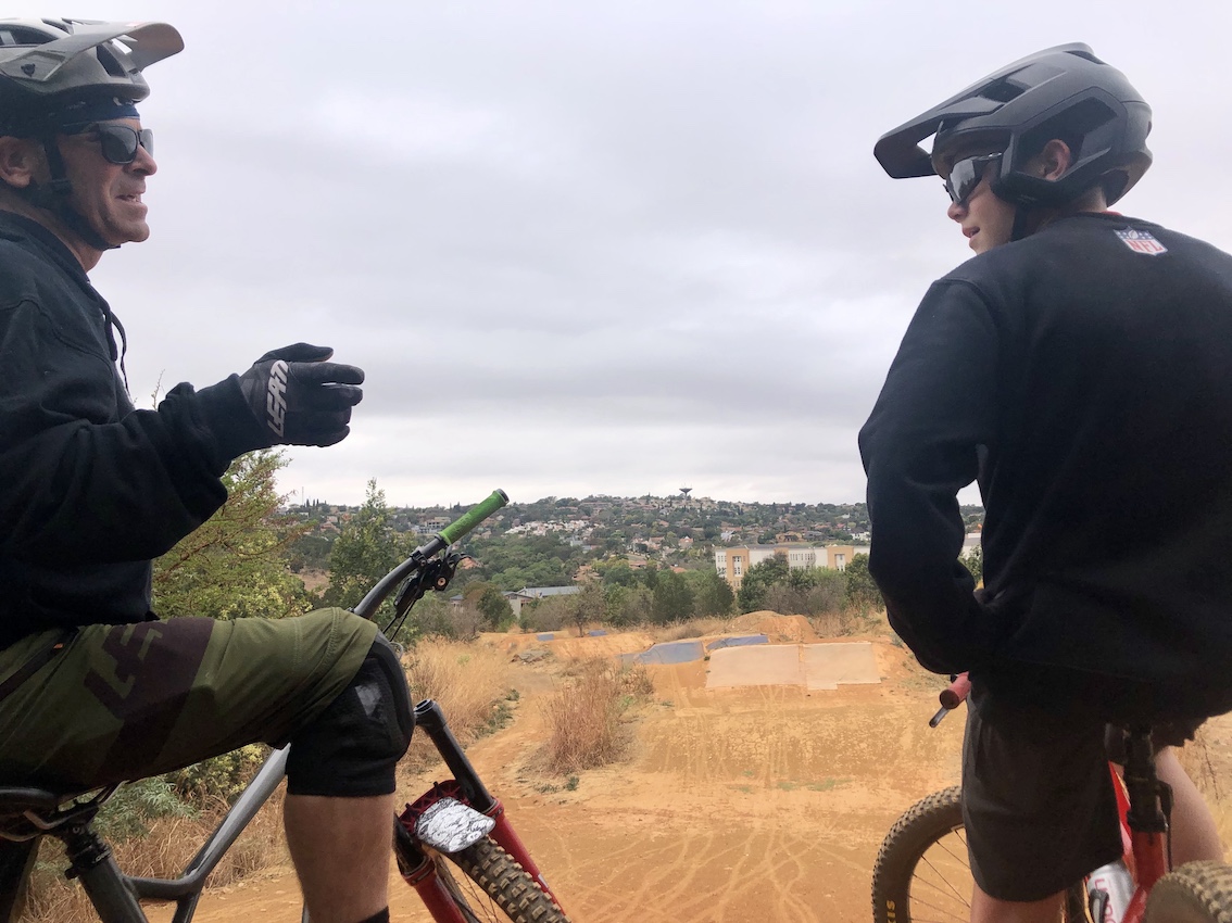The first session covered the importance of ‘pumping’ the bike through turns in the flat parking lot and then progressing onto a pump track. Cade is accustomed to flat pedals, but this was my first ride with them. Barry likes to use Wolwespruit venue in Pretoria as the pump track is well made and maintained and the jump line was built and honed by him, Ryan du Rand and Daan Goosen, all perfectionists in the art of getting air…
