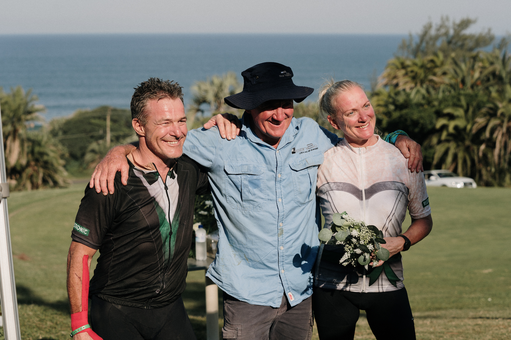 Attie and Marinda with Farmer Glen Haw at their most unique post-sani2c wedding. | Photo: Jenna Bird