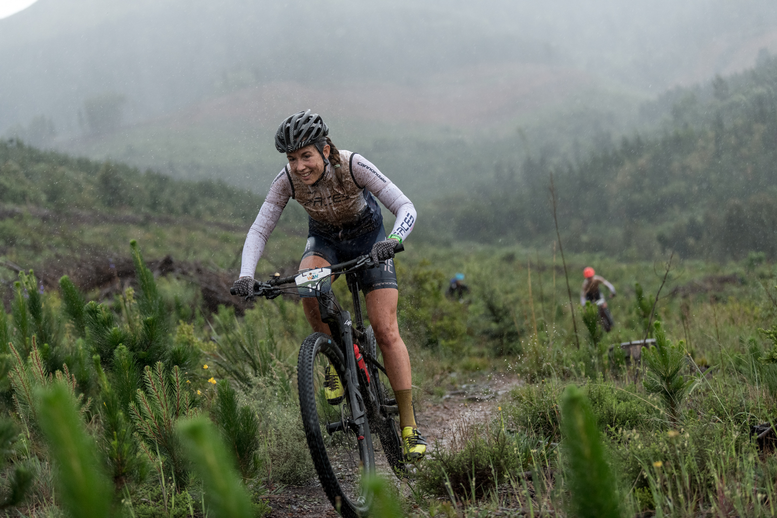 The Faces team of Candice Lill and Adelheid Morath got their FNB Wines2Whales title defence off to a winning start on Friday, 25 October. Departing Lourensford Wine Estate in consistent rain, the Elite Women endured a muddy day on the bike, but that did little to dampen Lill and Morath’s spirits as they thrived in the wet conditions.
