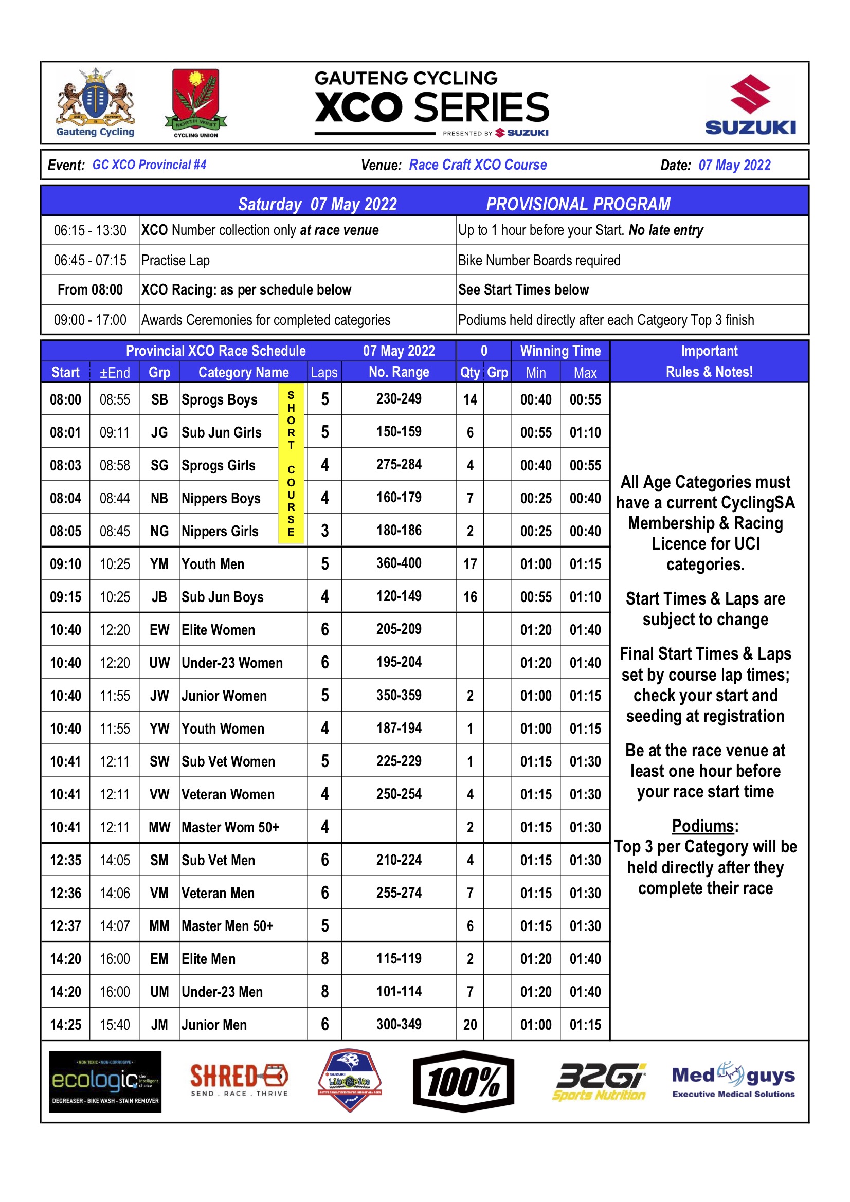 Suzuki is the presenting sponsor the 2022 Gauteng XCO Series. Other brands that have invested in the sponsoring the Gauteng XCO Series are EcoLogic (bike wash products), 100% (eyewear products), 32 GI (performance supplements), Med Guys (medical support) and SHRED (media partner).