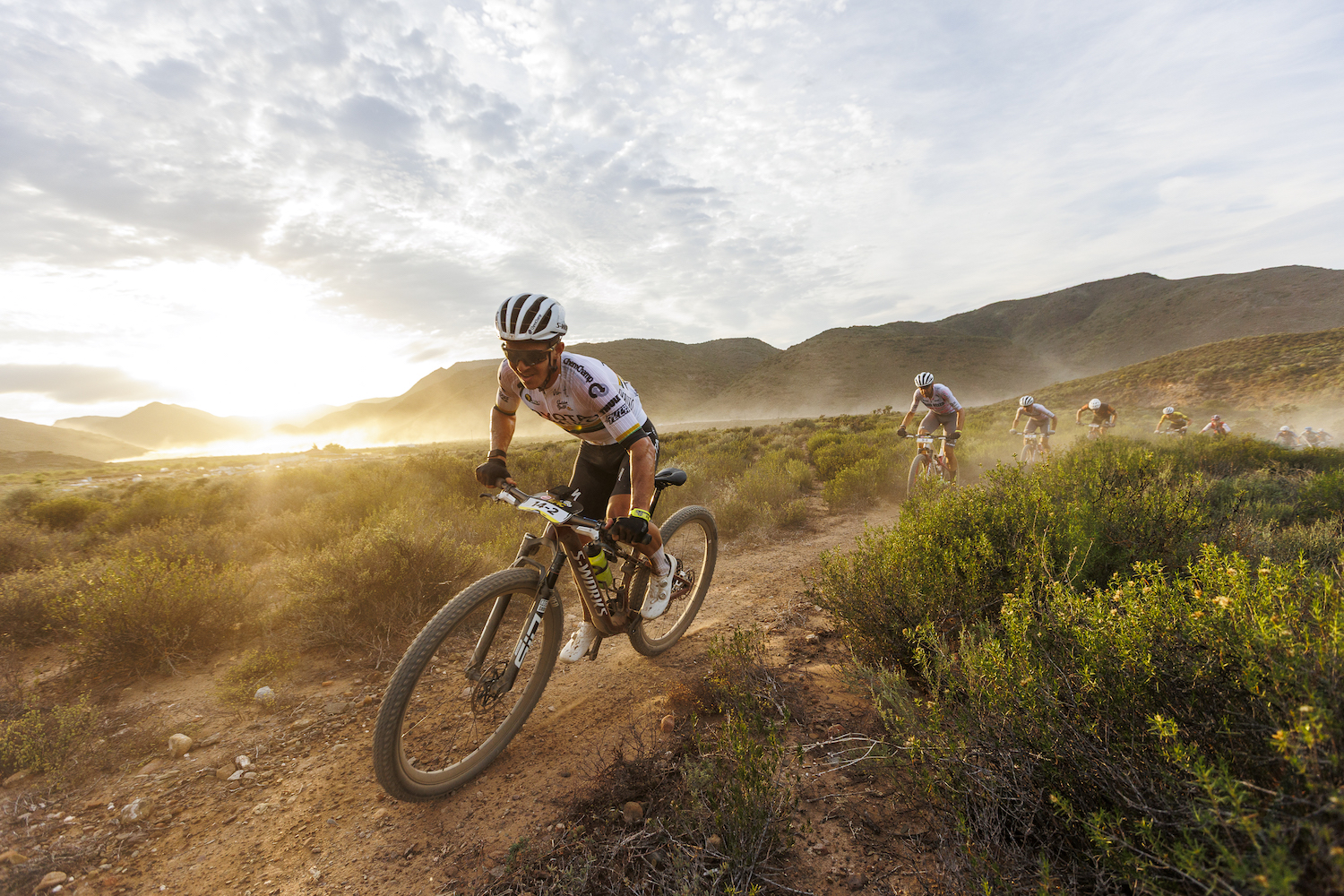 Over one of the longest stages in Absa Cape Epic history, the combination of tar sections, singletrack and gravel roads made for a fast pace at the front of the men’s elite race. By halfway, the group included almost all the elite teams, and, with few climbs to break it up, the stage looked as if it would be decided by a sprint.