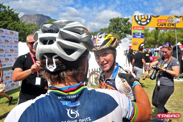 German mountain-biking legend Sabine Spitz and her Ukranian partner Yana Belomoina were queens of Boschendal Wine Estate today when they won Stage 5 in a time of 4:51.06,5.