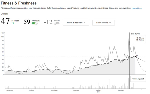 The aim of any decent training plan is to build fitness over time. This relies on gradually pushing yourself further and further, with the obvious drawback that you begin to fatigue over time. Fatigue is to be expected during training, but you want to arrive at races with maximum fitness and minimal fatigue. Strava provides a visual representation of the fitness-vs-fatigue relationship for Premium users. We’re not sure how they work it out, but you can see from this screengrab that it’s tracking pretty accurately over the past three months of hard training. This is incredibly useful information to have on hand to ensure that your tapering is going according to plan before the big race, so we’ll be watching these graphs over the next month or three to see if they remain accurate.