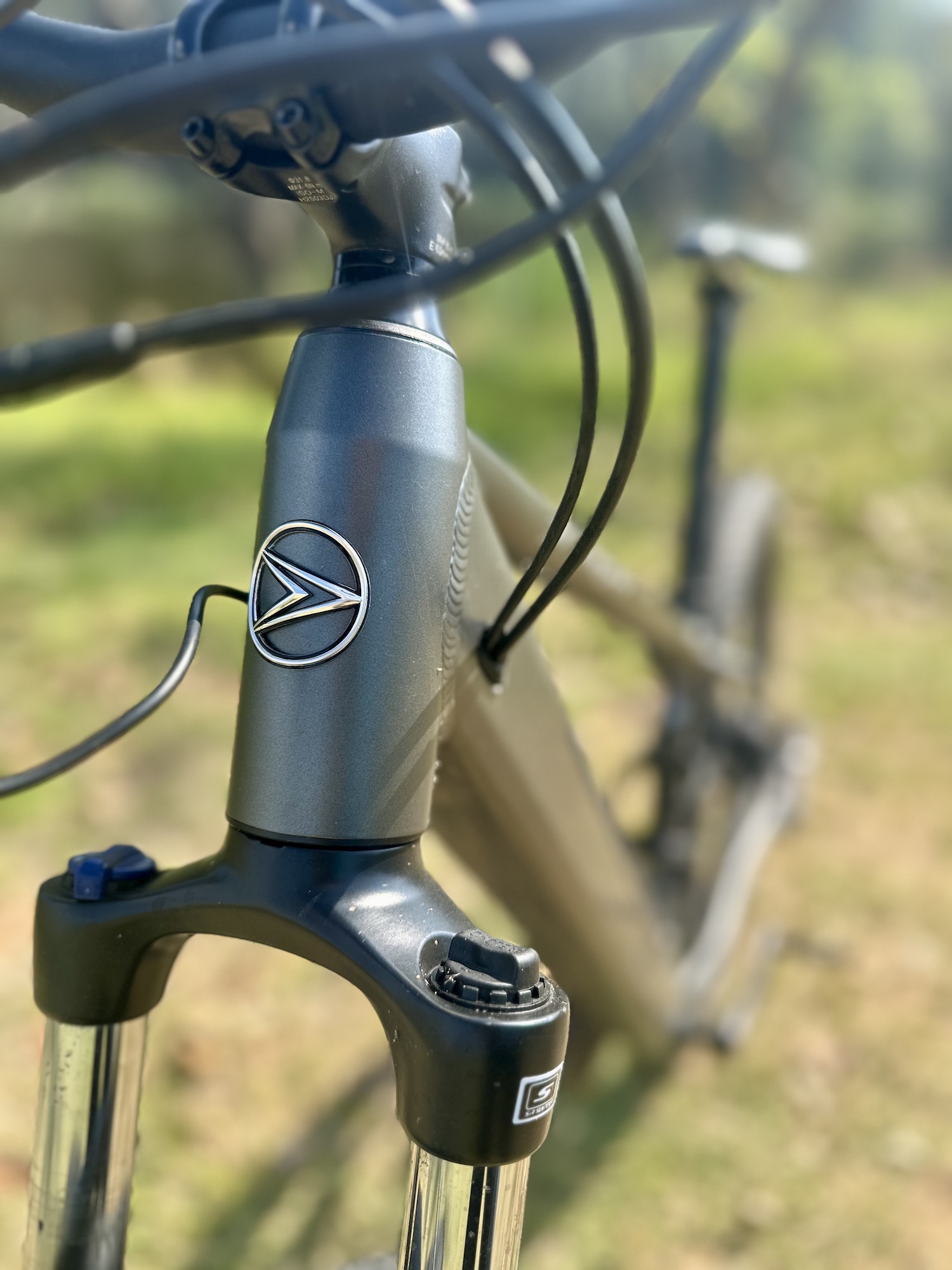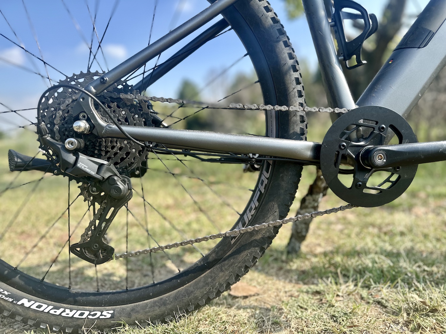 Aesthetically, the Thunder Grey finish is understated and classy. Branding is subtle, embossed into the top tube. The only colour accents are small German flag details on the downtube (“Designed in Germany”) and on the saddle rail. Claimed weight is 22.5kg – average for an eMTB, though slightly heavy for a hardtail.