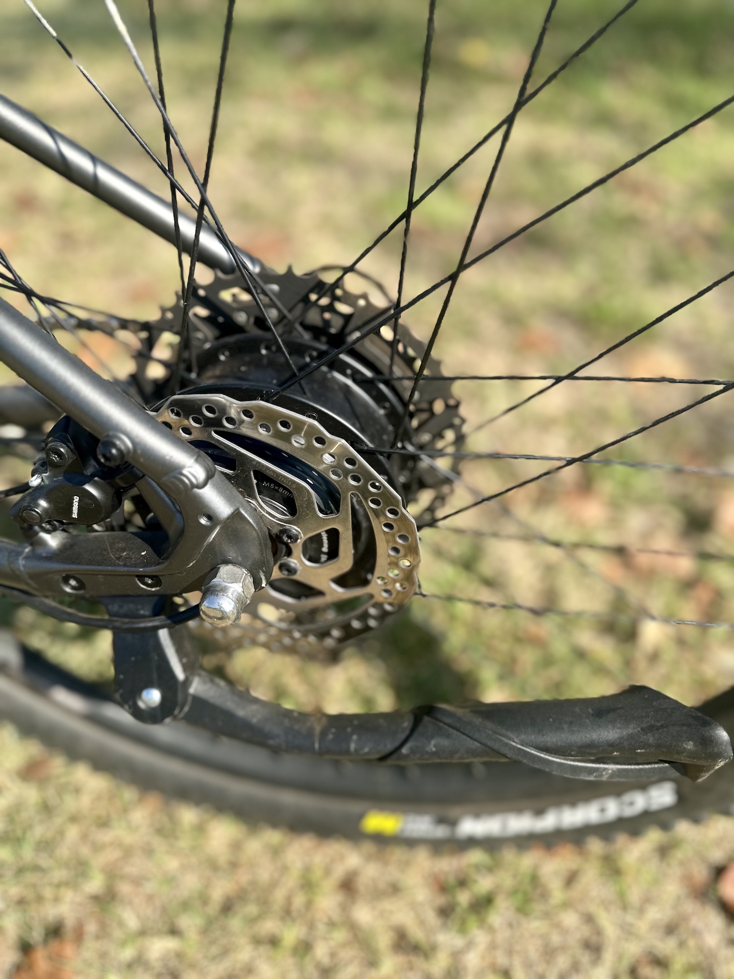 Up front sits a 120mm SR Suntour XCR coil fork. The wheelset comprises Silverback’s Surface-branded rims, paired with a Shimano HB-QB400 front hub (the rear hub houses the motor). Shifting is handled by Shimano’s 1×8 Acera drivetrain, while braking duties are taken care of by Shimano BL-MT200 hydraulic discs with a 180mm rotor up front and 160mm at the rear. The cockpit is entirely Surface alloy components.