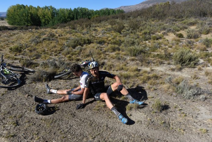 A broken wrist at the Tankwa Trek in February hampered Hatherly’s (on the left) early season progress in 2018, but later in the year he won the Under-23 XCO world title. | Photo: Zoon Cronje