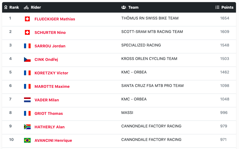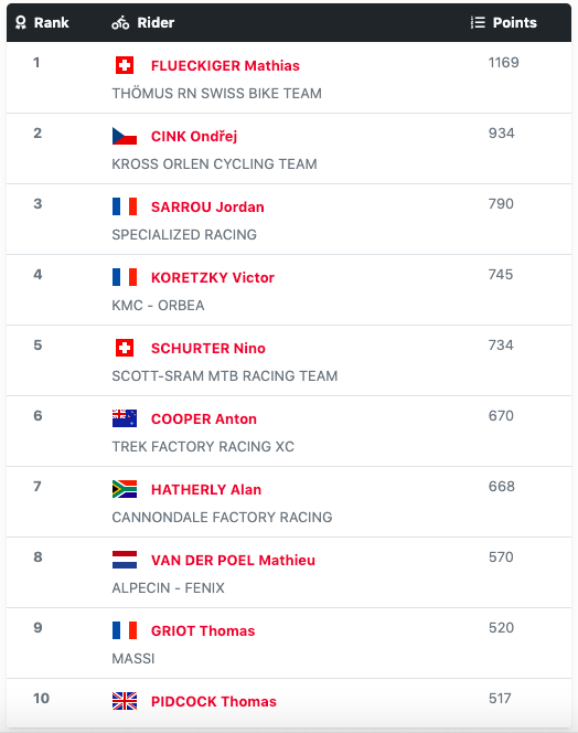 Current XCO World Cup Series Standings (as at 04 July 2021)